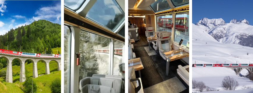- Glass-domed coaches offering uninterrupted mountain views